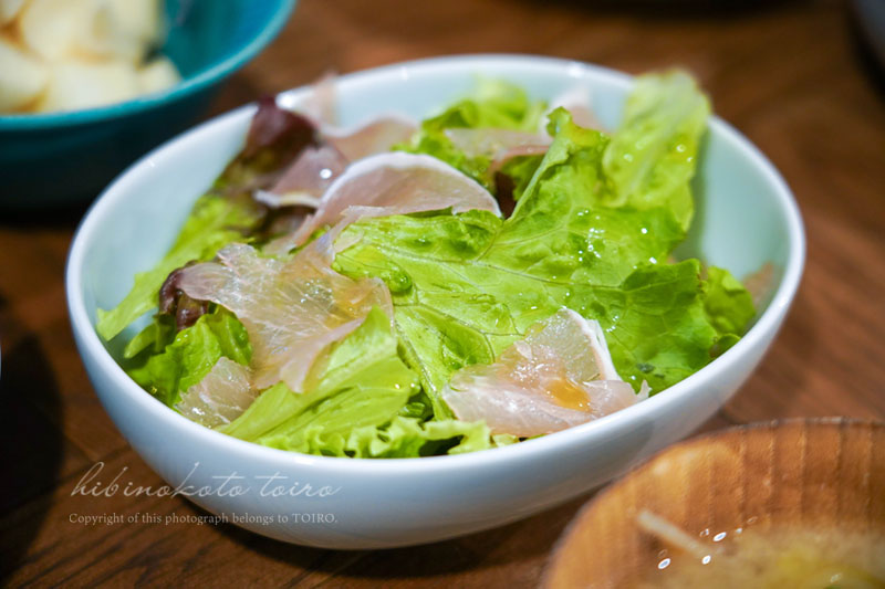 野菜サラダもね、生ハムとオリーブオイルで食べたよ。