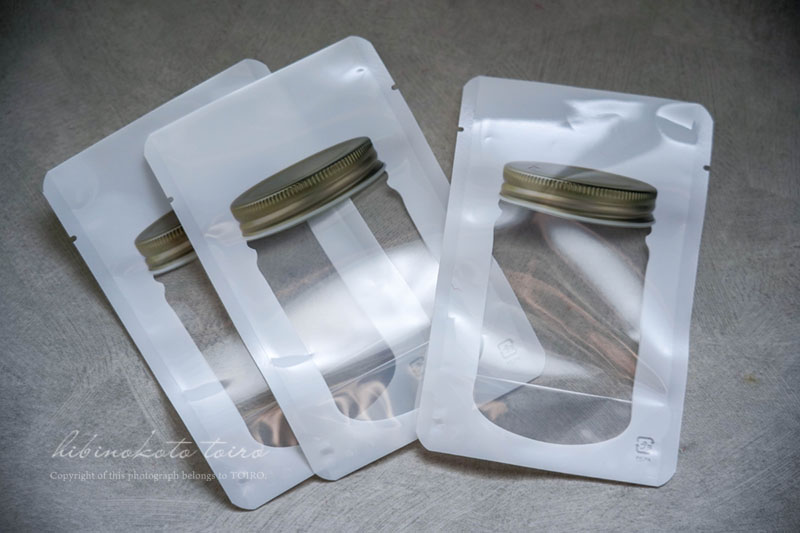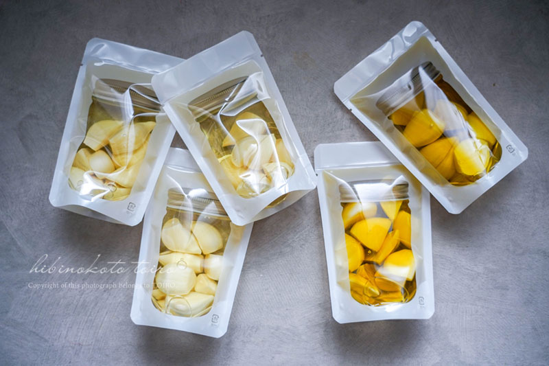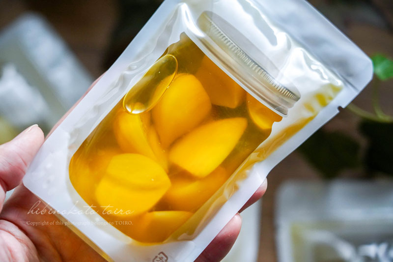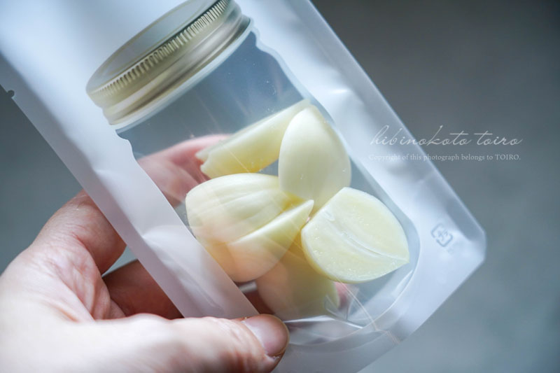 スタンドパックに入れます。何個でもいいですよ。オイルで浸すので、いい感じの量で。笑