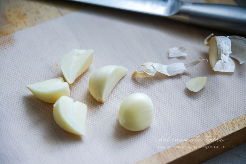 ニンニクは皮を剥いて、半分にカットして、あれば芯を取り除いておきます。