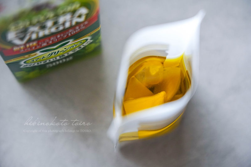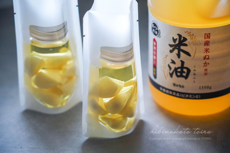 オリーブオイルは今ちょっと高級なんで、私は米油でも仕込みました。