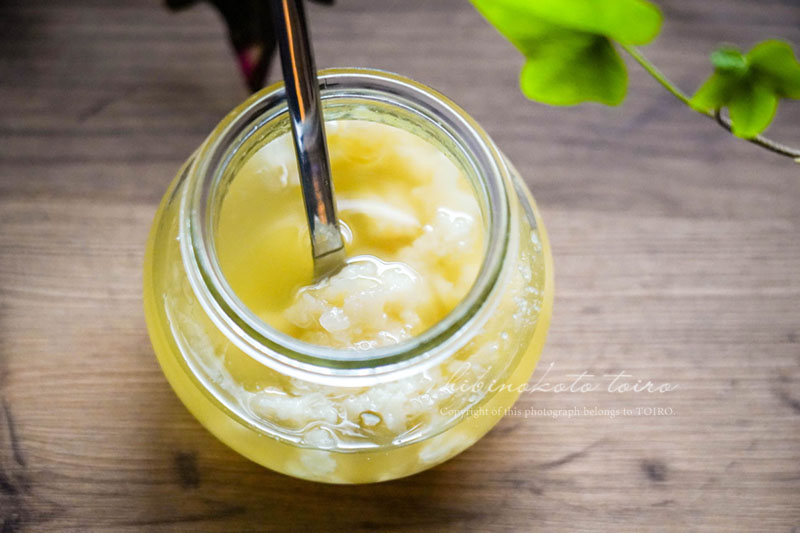 これやっとくと冷蔵庫で3ヶ月ほど保存できるし、ニンニクの皮を剥いたり、みじん切りにしたり、なんてことをしなくてもすぐに料理に使えるのです。