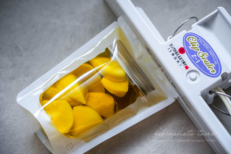 出来るだけ中の空気を抜くようにしてシーリングします。