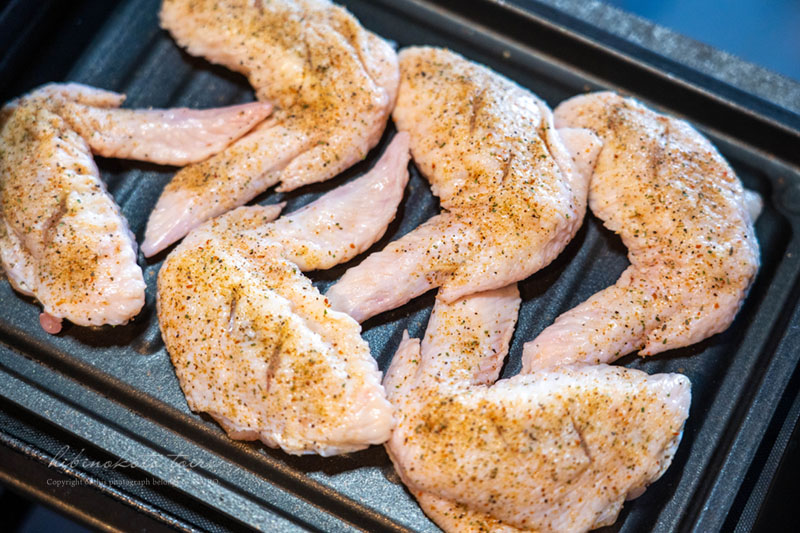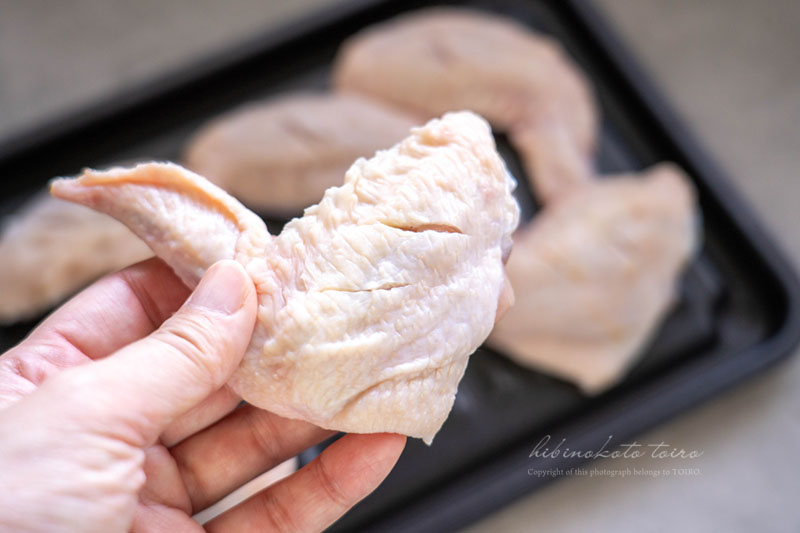 手羽先を買ってきたら、皮目に2カ所ほど、裏側に一カ所ほど切り込みを入れます。