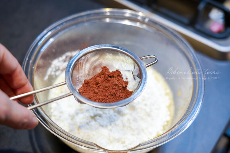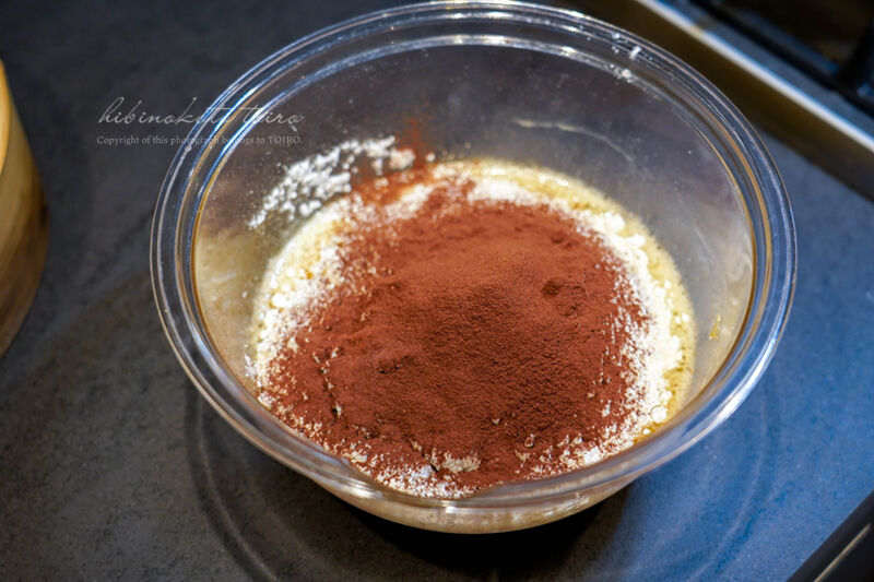 ホットケーキミックスとココアパウダー(茶こしでココアだけはふるってね)を加え、ゴムベラで さっくり練らないように混ぜます。