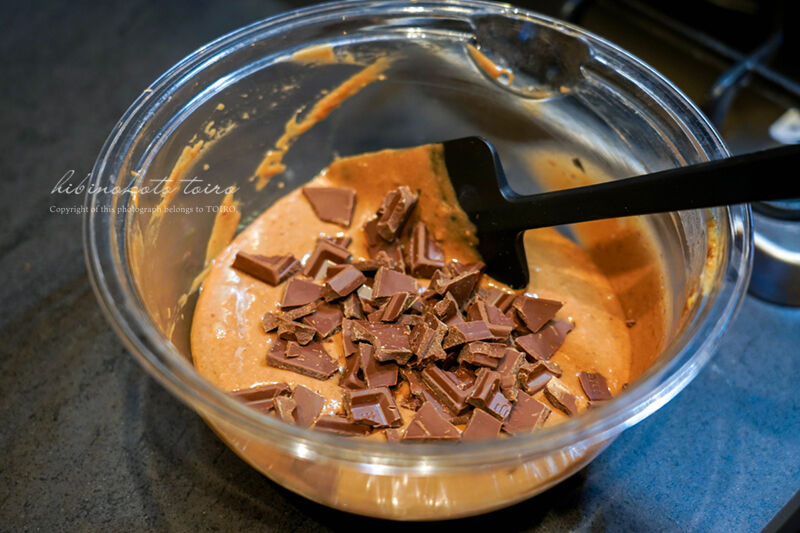 手で適当に割った板チョコを加えてさっくり軽く混ぜます。(ここでも混ぜすぎないで!)