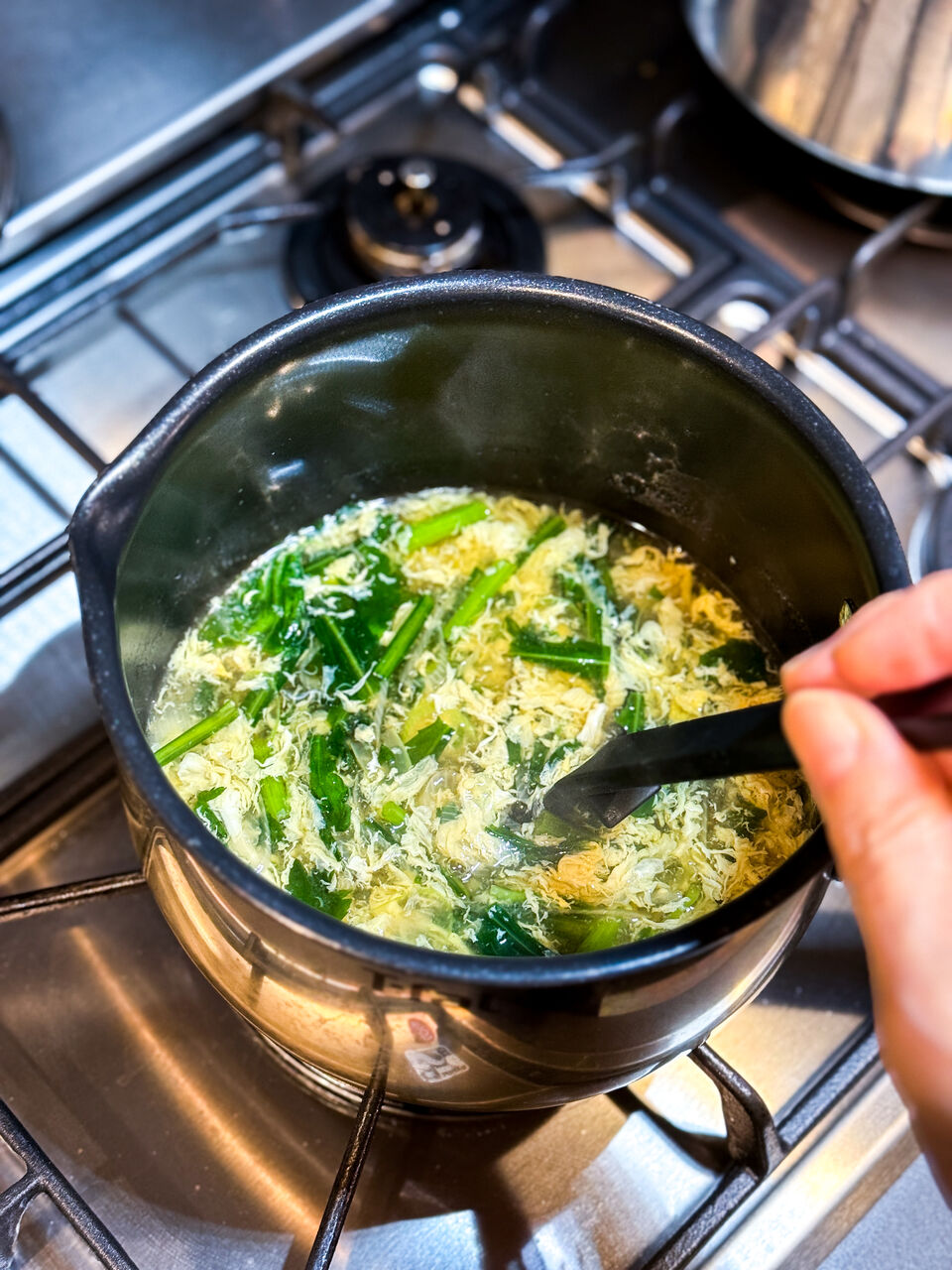ってことで、身体のあったまる汁ものを作ろう!!と、冷蔵庫にあった春菊半束と、白ねぎでかき玉汁を作りました。