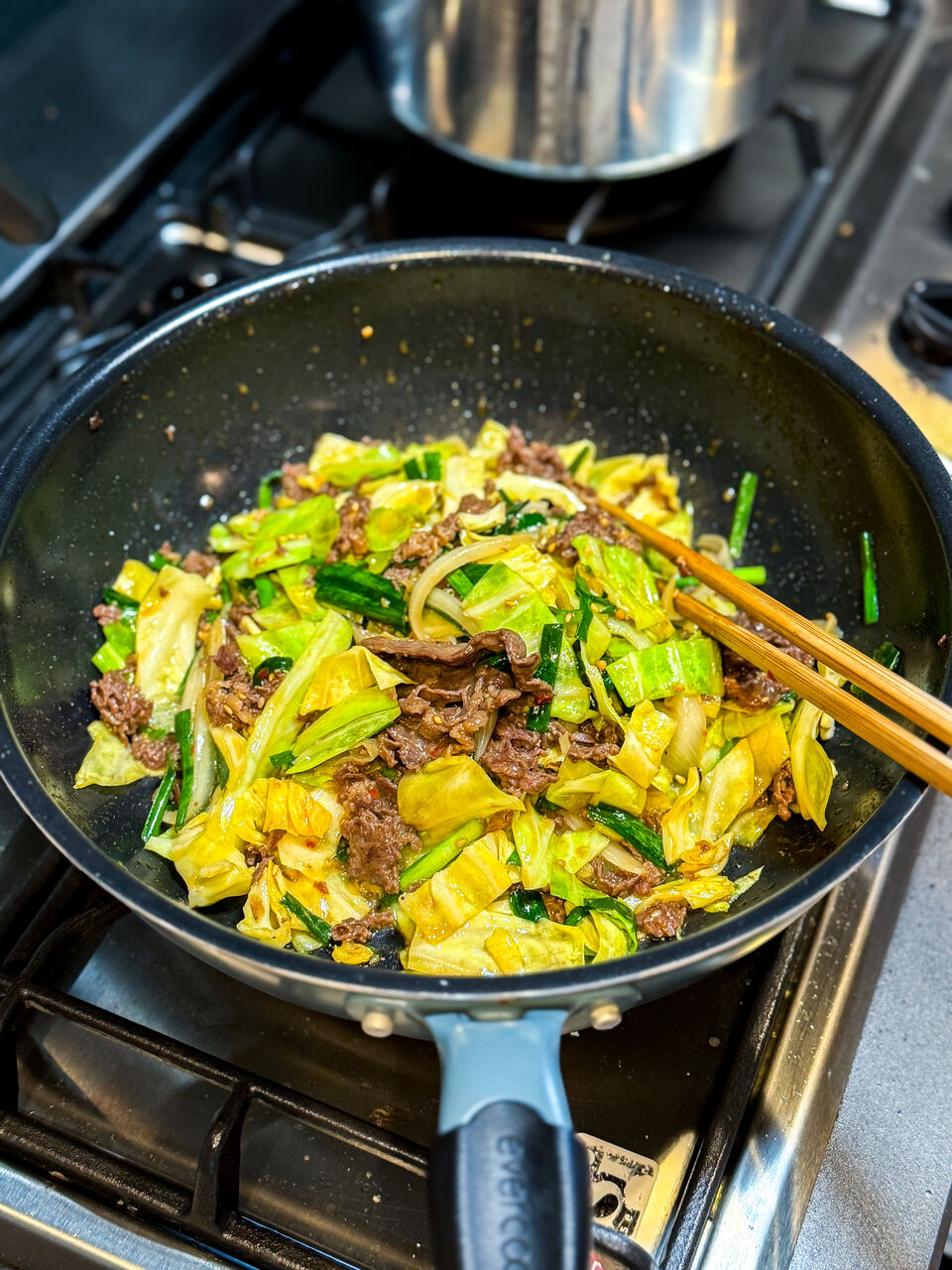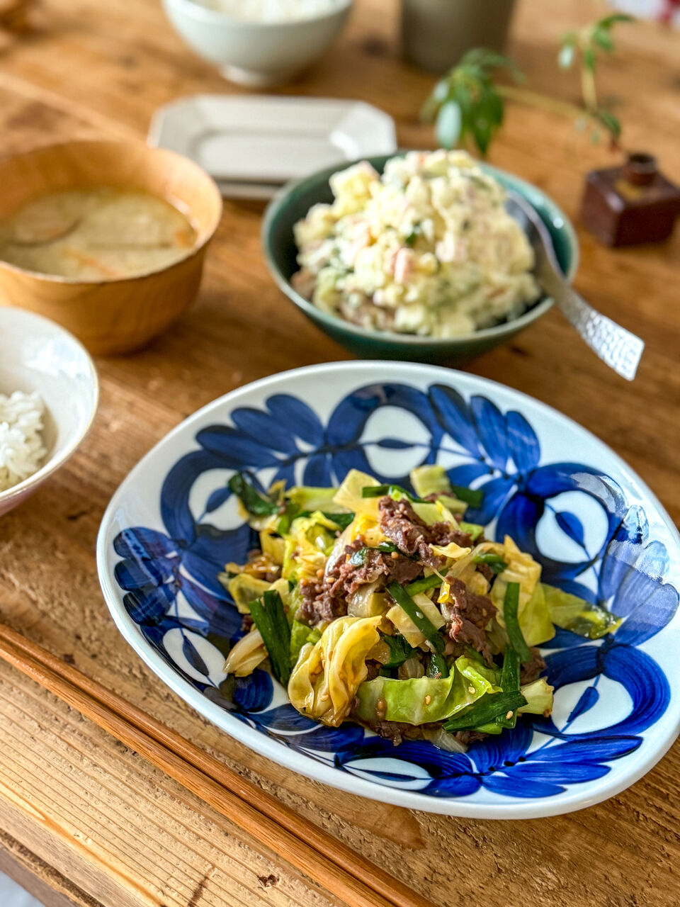あと、買い置きしてたプルコギビーフを解凍して、キャベツやタマネギ、ニラと野菜炒めに。