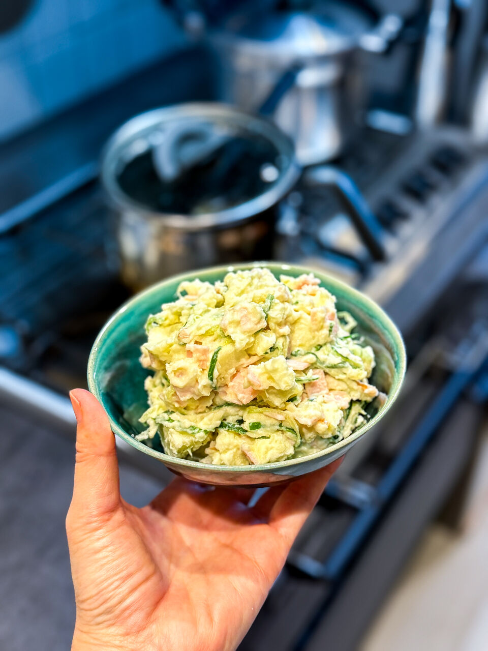 今日はお昼に冷凍のマッシュポテトを使ってちゃちゃっとポテトサラダを作りました。