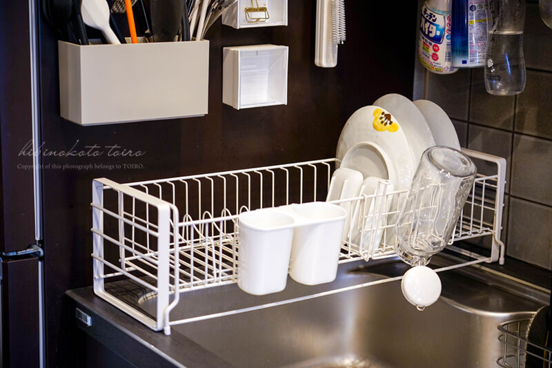 お皿も、大きなものから小皿まで、きちんと立てて置けるから水も早く切れて乾きやすくなったし、コップやお箸などはそれぞれ置く場所ができたからごちゃごちゃしない!