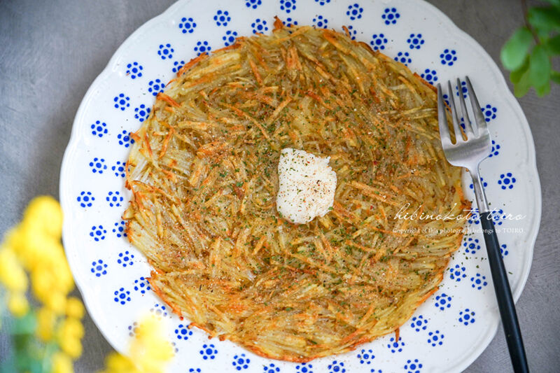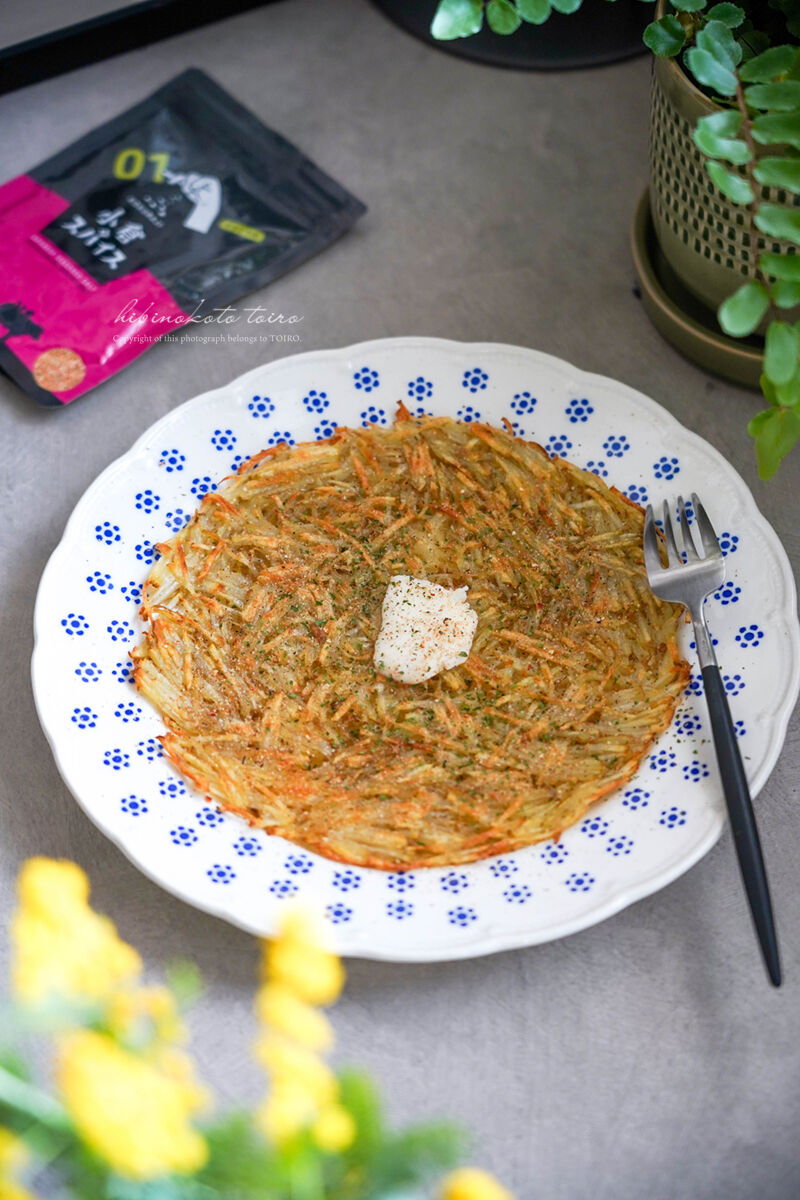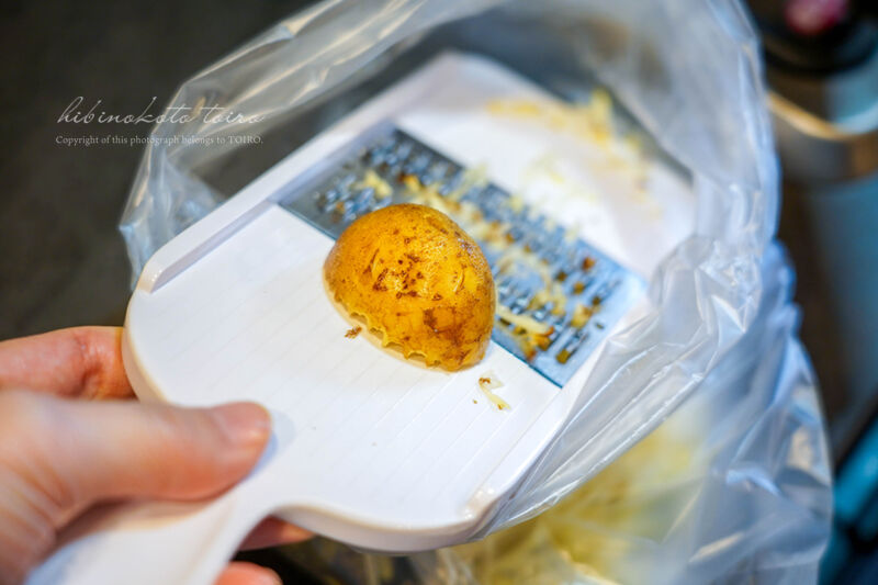 私はよく洗った新じゃが(130gほど)を皮ごと使いました。あと、細切りスライサーも。