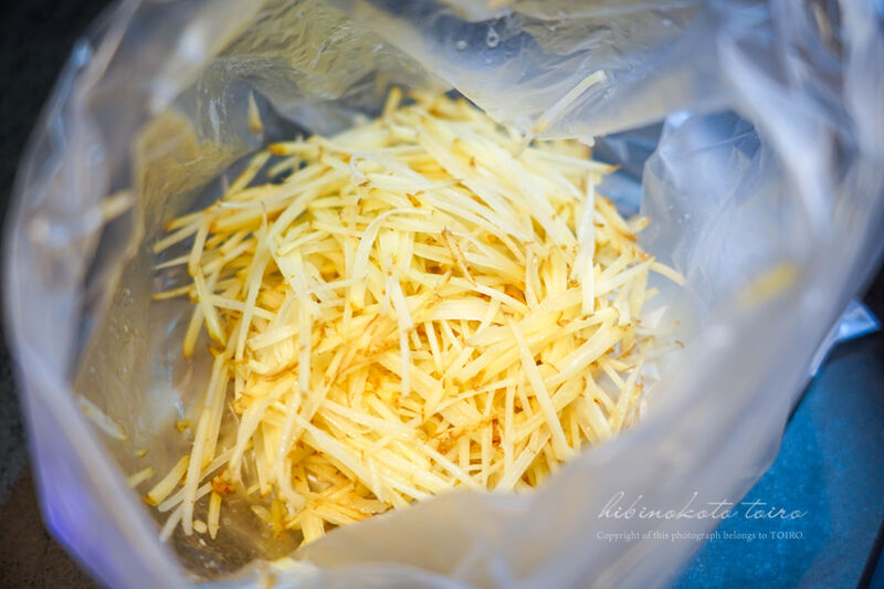 じゃがいもを全て入れたら、袋の口を持って、全体に片栗粉がまぶせるようにシャカシャカします。