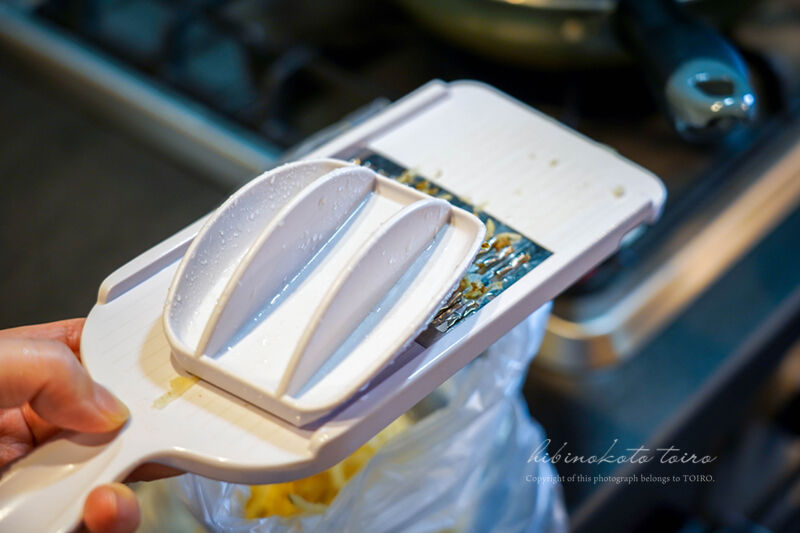 千切りスライサーがなければ、薄切りにするのだけスライサーを使って、