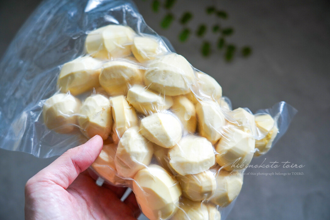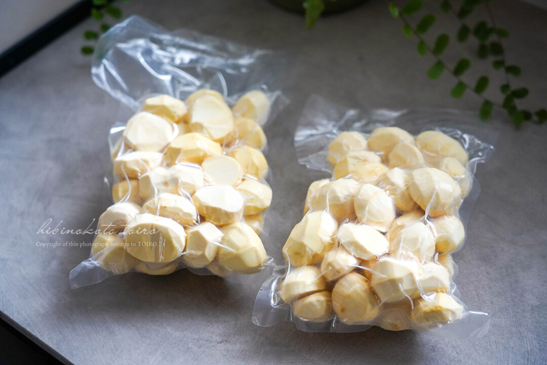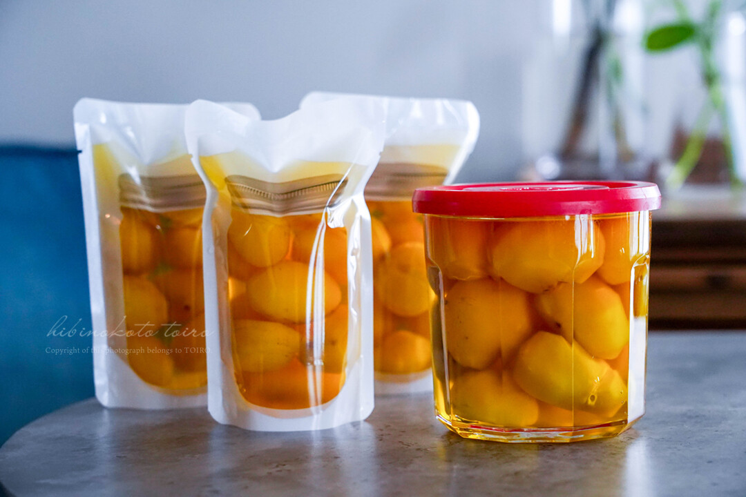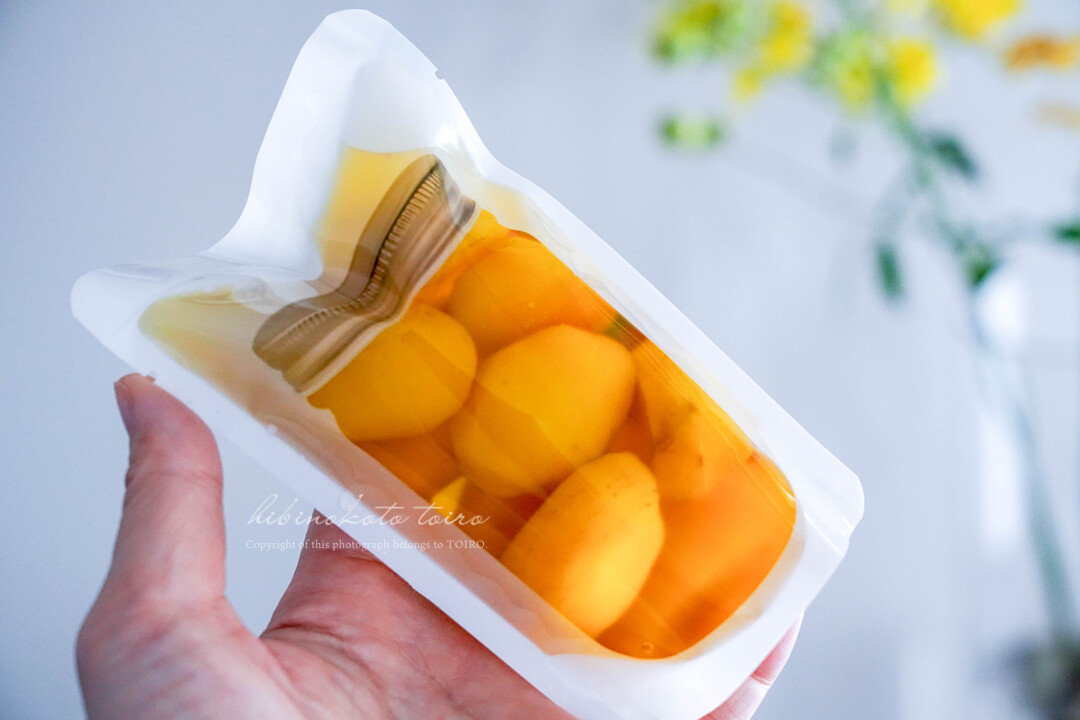 ジャムとかこういう甘露煮とか常備菜とか、作りおき出来るものはスタンドパックに入れて冷凍して長く楽しむようにしています。