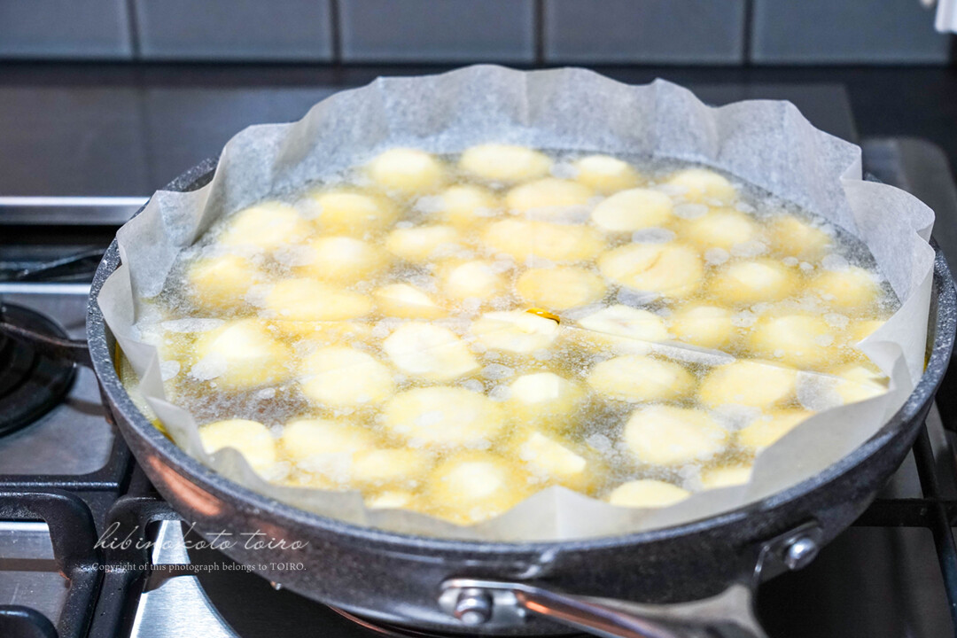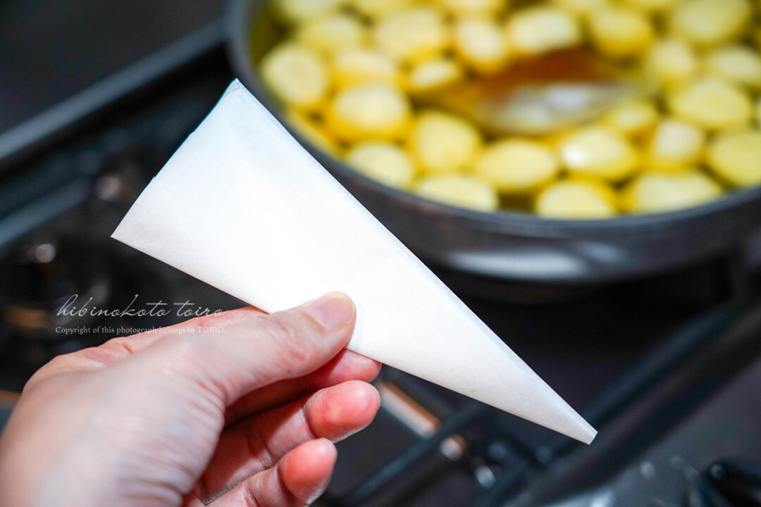 クッキングシートは、こんな風に折ってから、フライパンのサイズに合わせてカットして、中心も少し切り落として穴を開けてセットしますよ〜。