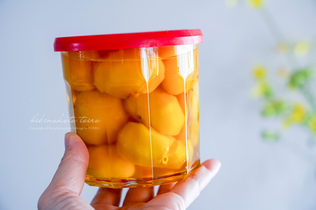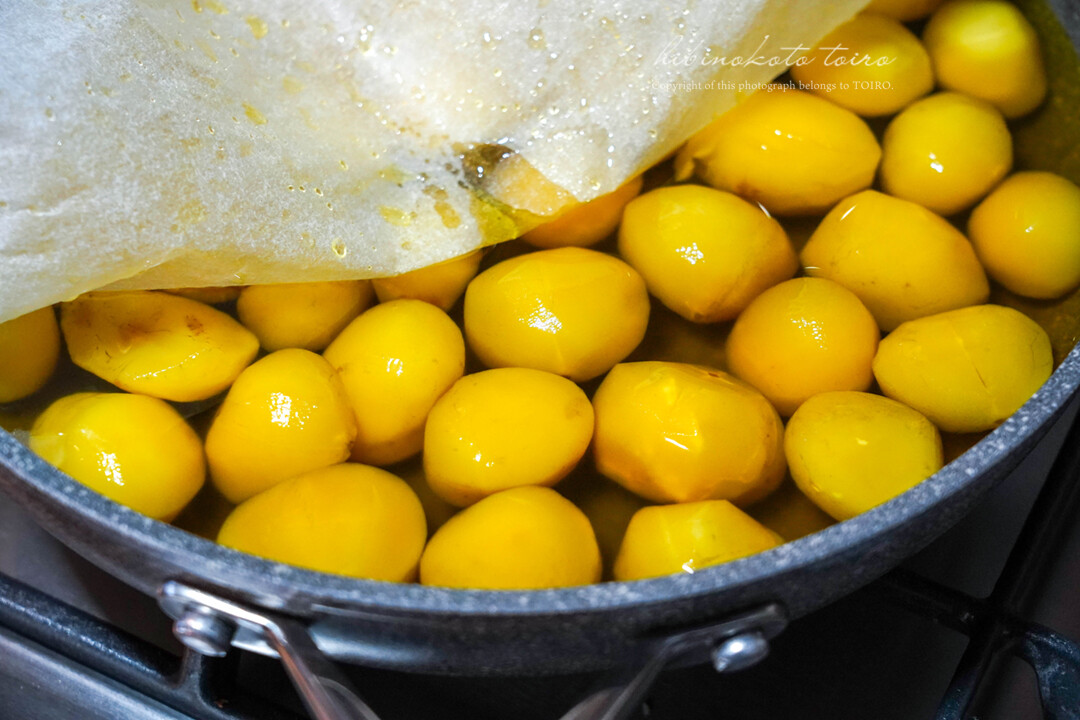 栗おこわにしたり、お菓子作りにする分は煮汁に浸して保存容器に。(数日以内に使う分)