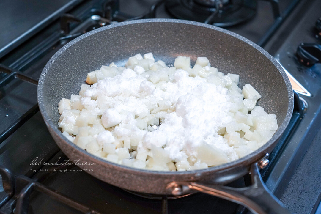 ②鍋に梨・砂糖を入れて10分ほど置き、水分が出るのを待つ。砂糖の量は梨の甘さで調節します。甘い梨だと30%でいいですね。あまり減らすと日持ちしなくなるから減らしすぎないように^^