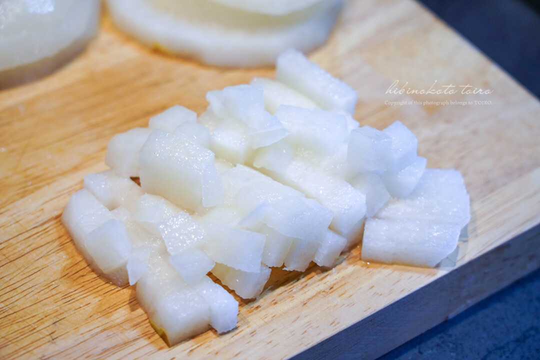 好きな切り方でいいんですけどね、このさいの目に切る方法が一番好きです。サイズを揃えやすいので。