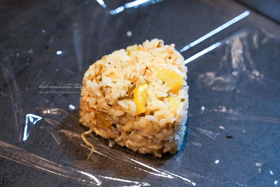 この方法だと炊きたて熱々のご飯でも素手で握らなくて済みます。ちゃちゃっとラップの上から成形するだけでいいので◎