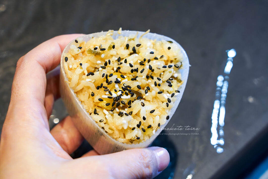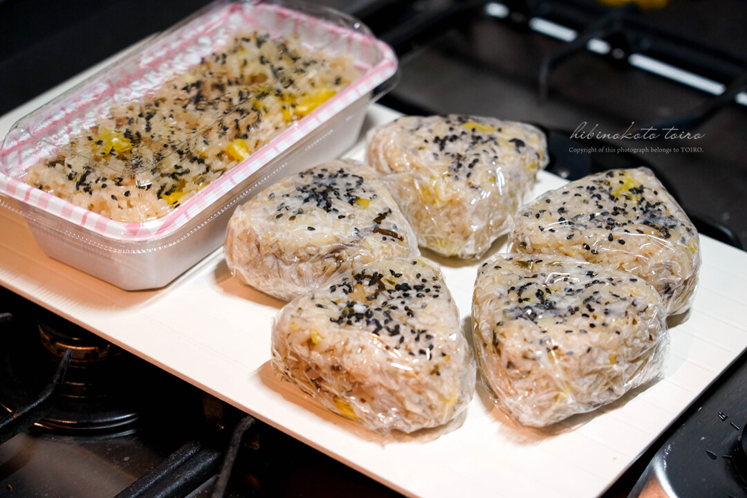 いつもこんな風に100円ショップのおにぎりメーカーにごはんを詰めて、ごま塩をふって