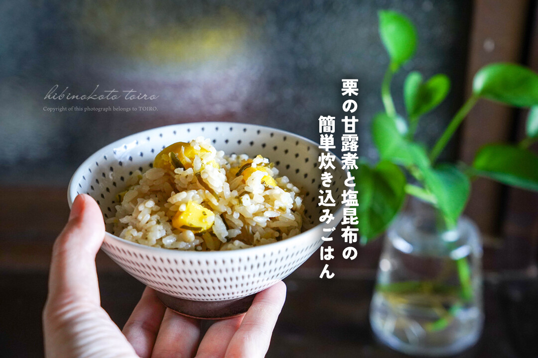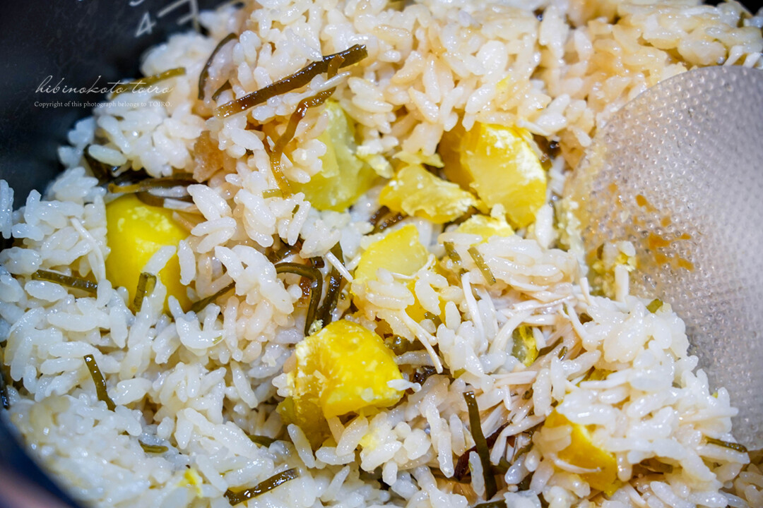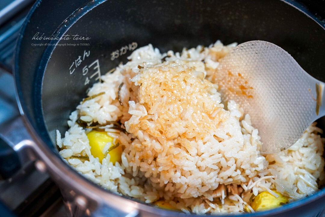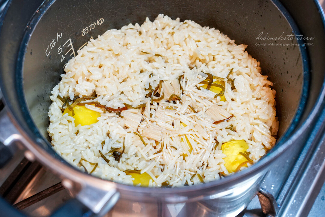 酒を大さじ2入れてから、2合の目盛まで水を入れたら、塩昆布15g、冷凍しといたエノキ1束分(これはシメジでもOK)、栗の甘露煮を6〜8個ほど入れました。