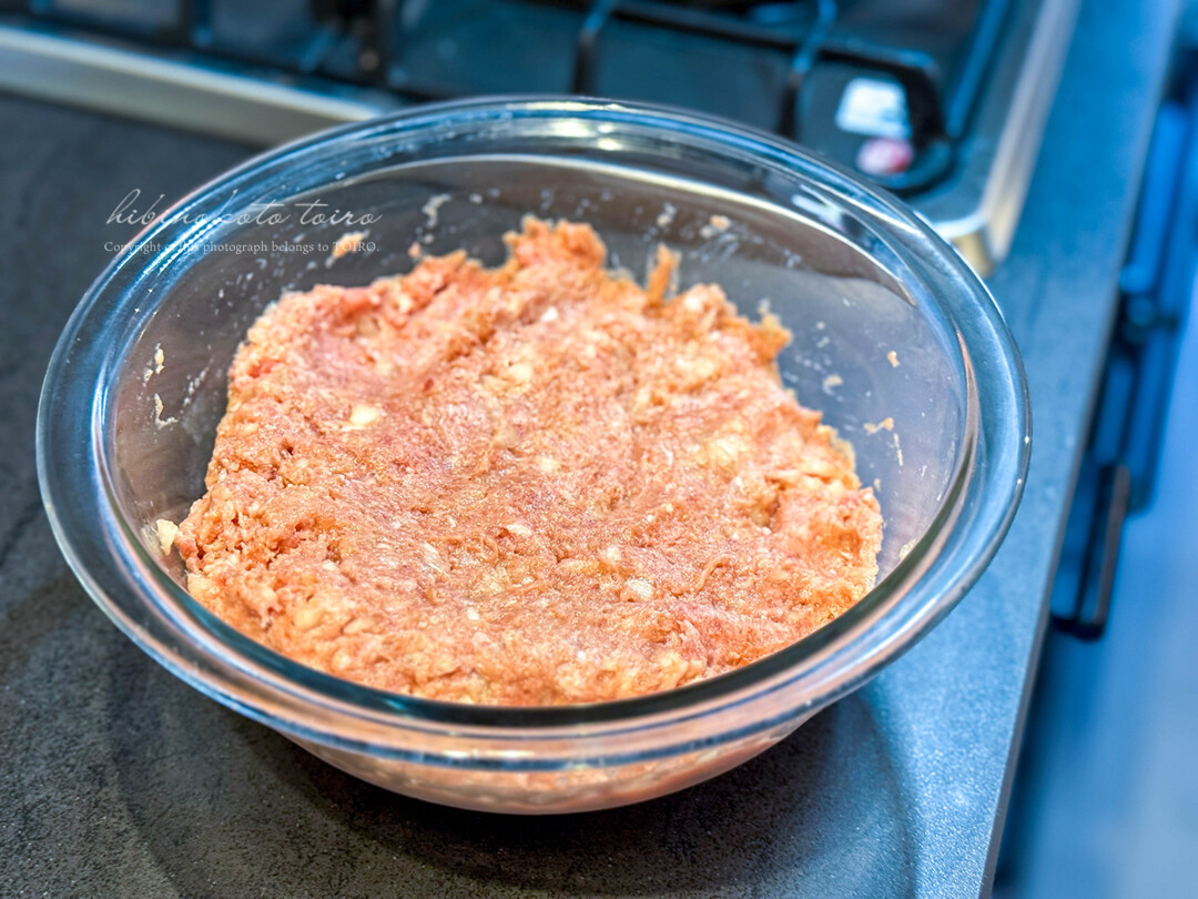 ②ボウルに豚ひき肉を入れ、塩を加えて粘りが出るまでよく混ぜる。しょうが・醤油・酒・砂糖・ごま油・片栗粉・タマネギを加えてさらに混ぜる。(最初に塩で肉汁を閉じ込める!)