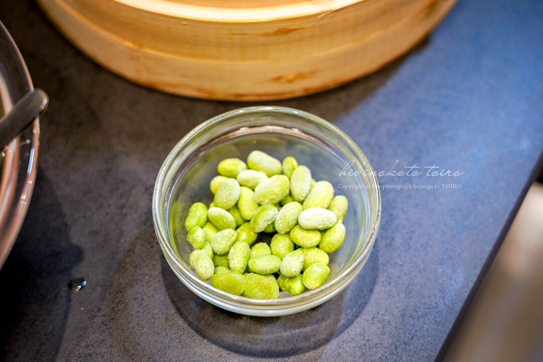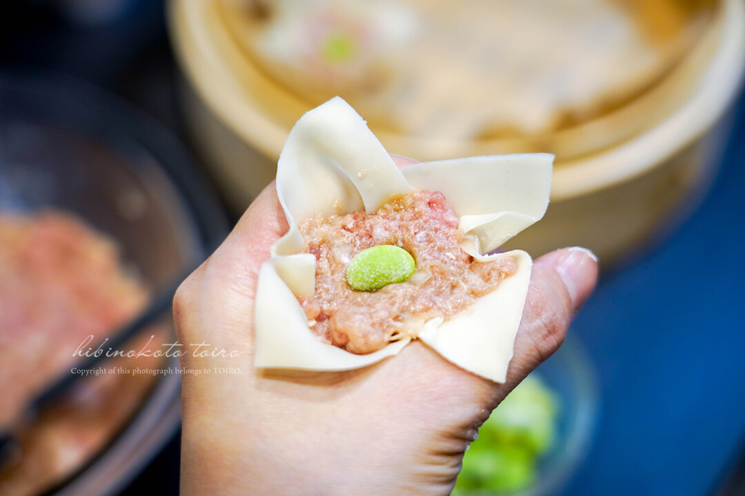 ③親指と人差し指で輪っかを作って、そこに皮をはめる。皮の中央にたねをのせて、軽く握るように包む。冷凍のむき枝豆があったから、真ん中に埋め込みました。(分量外)
