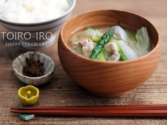 アスパラガス、春キャベツ、新玉ねぎと、春野菜と豚肉をたっぷり使った食べる味噌汁です。