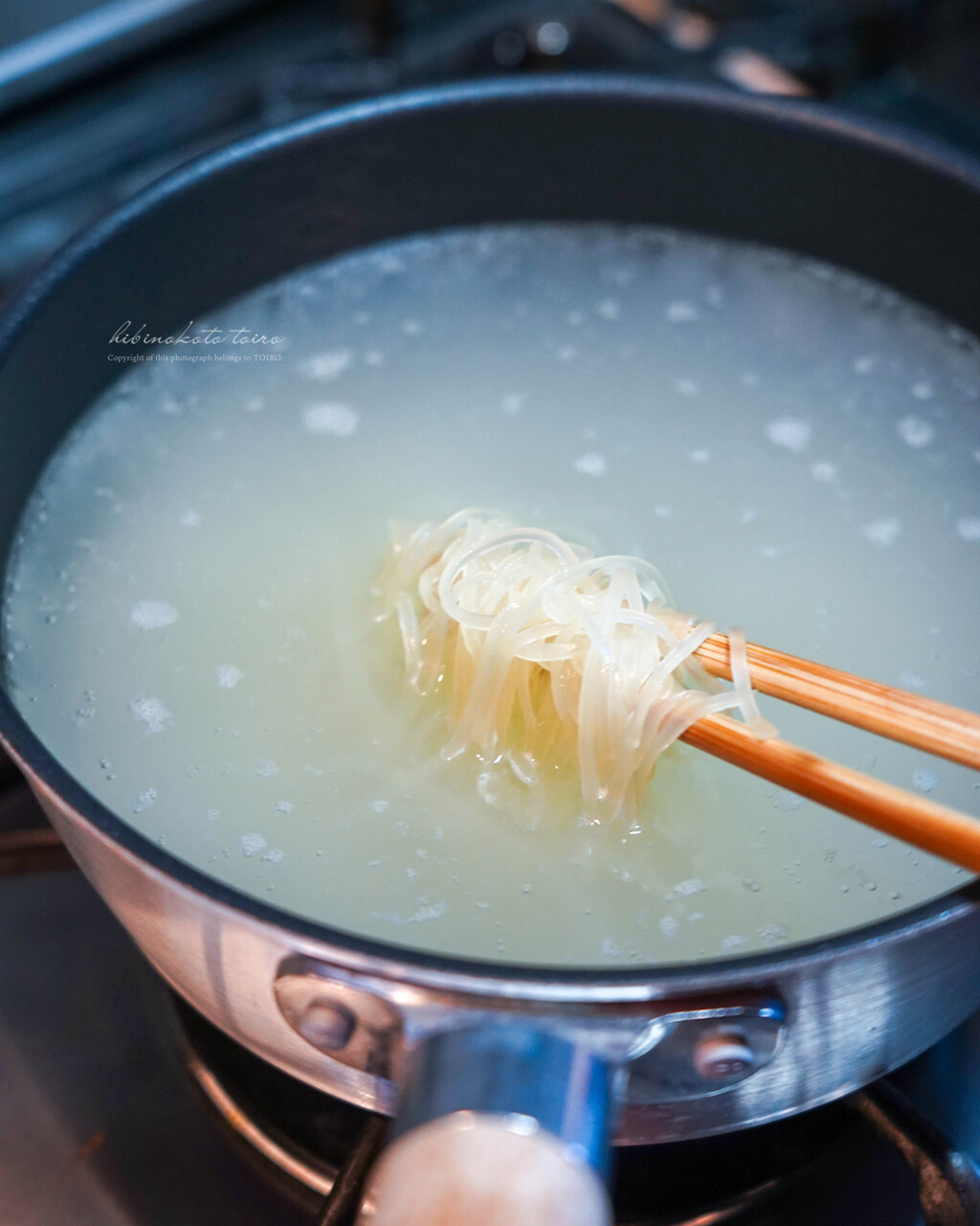 たっぷりのお湯を沸かして麺を茹でます。1〜2分でいいとのことですが、私は柔らかめがすきなので、2分茹でました。透明な麺!!