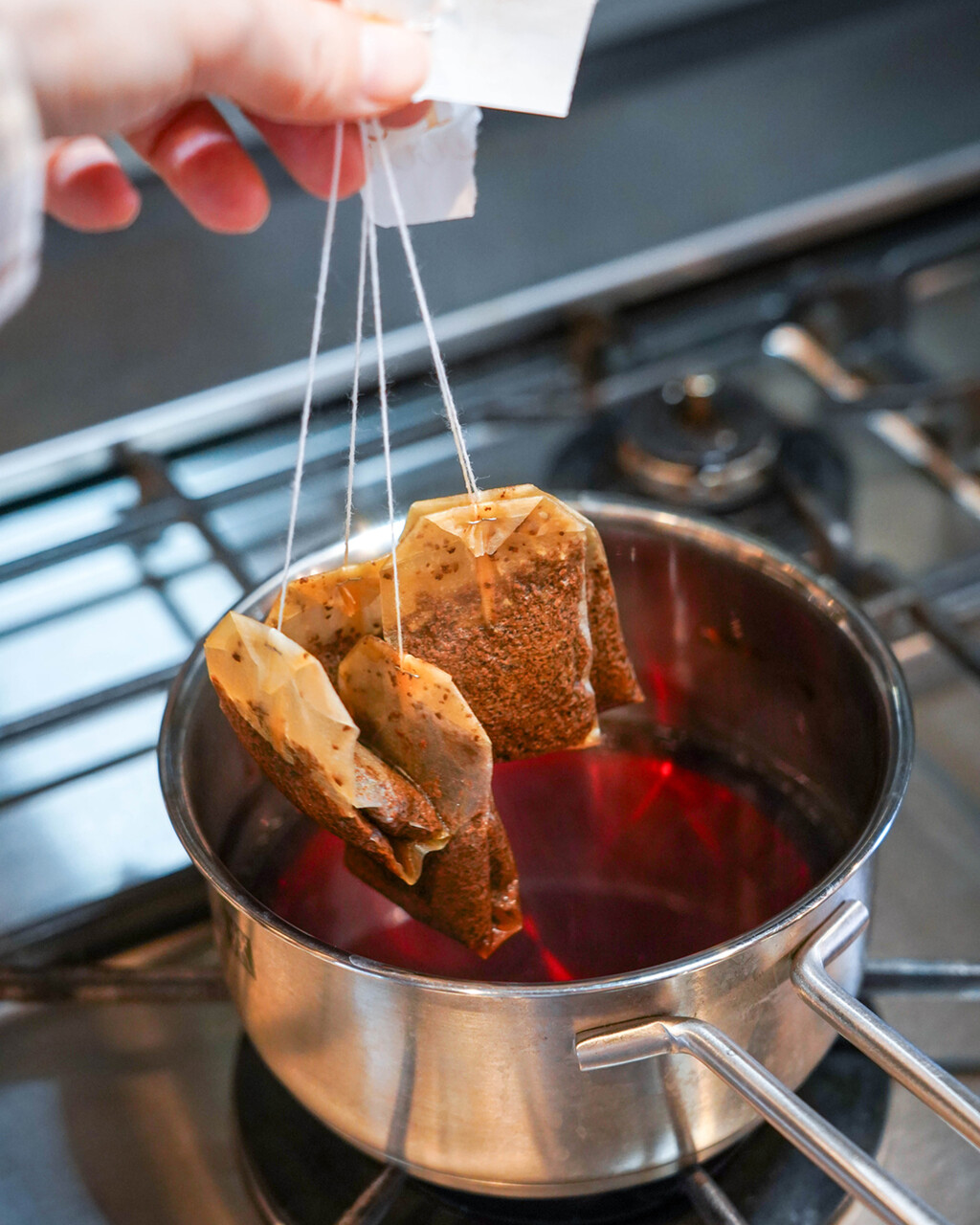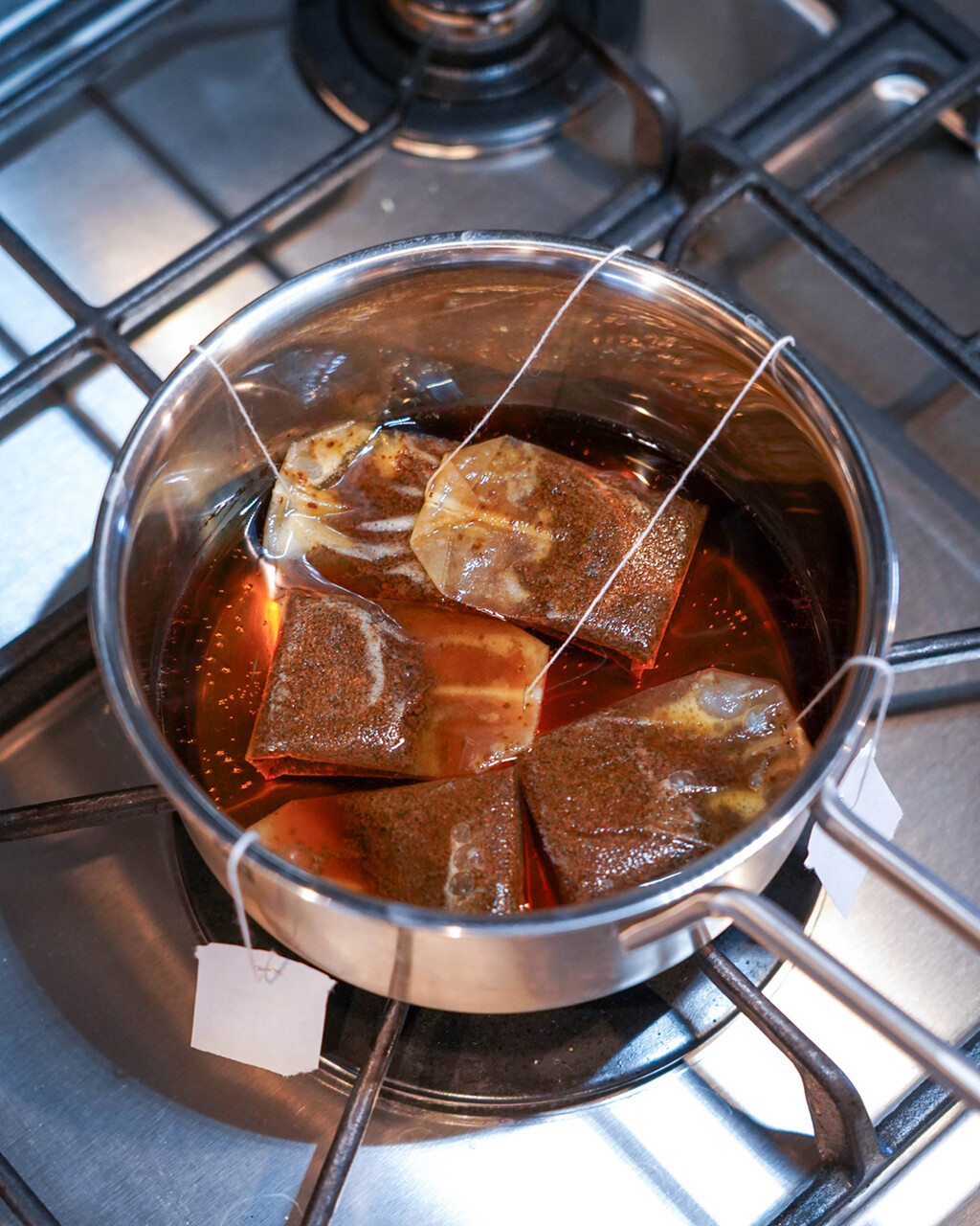 ② 火を止めてティーバッグを入れ、蓋をして5〜7分蒸らす。