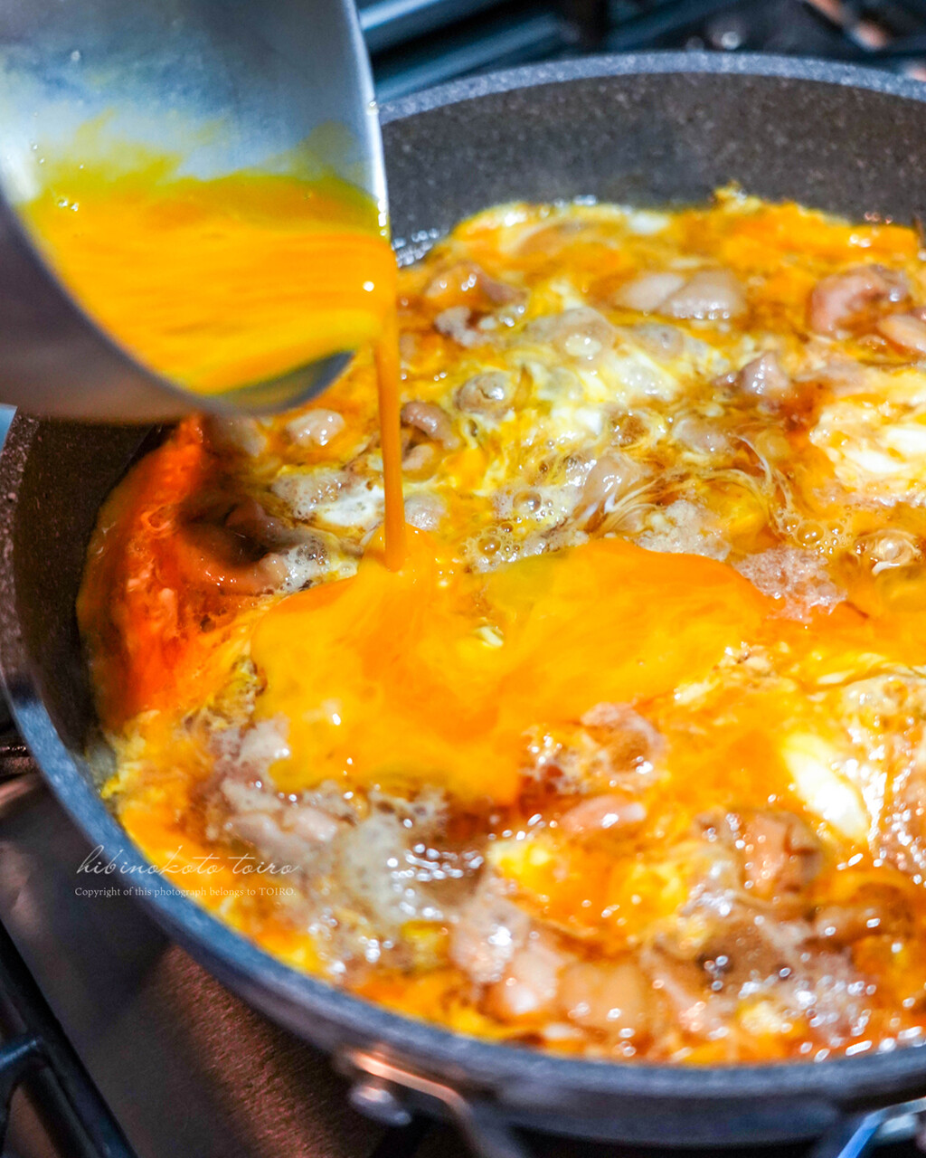 ⑤ 卵は4個まとめて溶きほぐしておく。煮汁が再び沸いたら溶き卵の2/3量を回し入れ、ふたをして30秒ほど蒸らす。残りの1/3量を加えてさっと混ぜ、半熟のうちに火を止める。